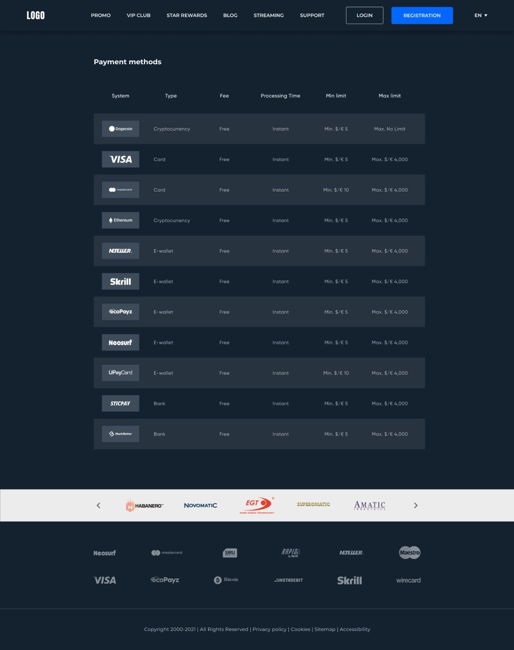 | Programas de marca blanca | Cooperamos con más de 50 proveedores. Nuestro equipo ofrece soluciones listas para entrar rápidamente en cualquier mercado local o internacional. Tendrá la oportunidad de promocionar su marca basándose en un sistema de juego equilibrado certificado por los mejores laboratorios y comisiones de juego internacionales |